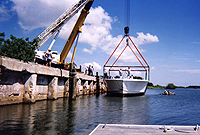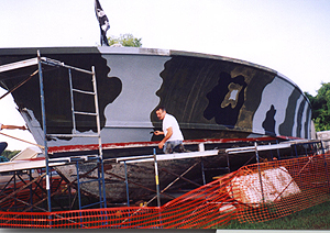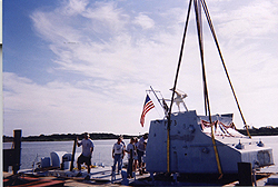 the boat was hauled from the water with two heavy cranes and placed a house moving rig.